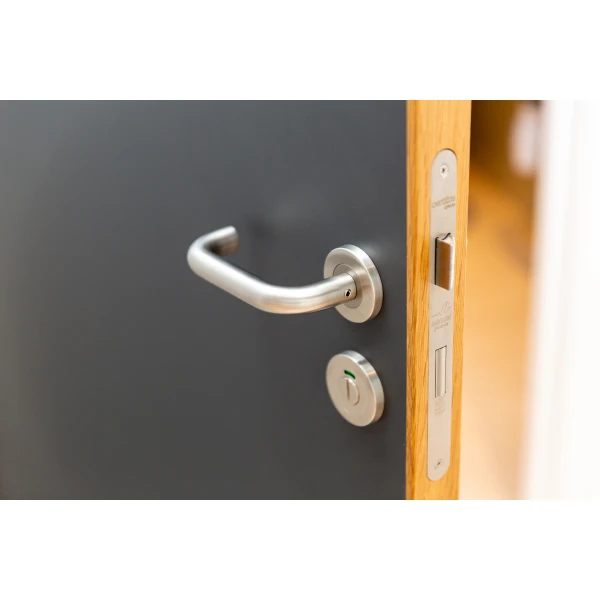 Our Prostyle Satin Stainless Steel finish exudes a clean, modern workplace feel which complimented the modern aesthetic of the architecture of the building. The pairing of both mitred and return to door levers creates a seamless and sophisticated look, ensuring a harmonious balance between functionality and design. This combination enhances the door’s usability while maintaining a sleek, polished appearance that aligns perfectly with the building’s contemporary style. The high-quality satin stainless steel not only adds a touch of luxury but also promises durability and resistance to wear, making it an ideal choice for any high-traffic environment.